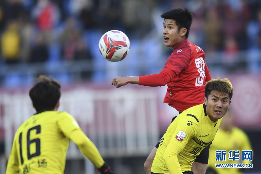 11月6日,辽宁沈阳宏运队球员王军辉(右上)在比赛中争顶。 当日,在2019年中甲联赛、中乙联赛附加赛首回合比赛中,辽宁沈阳宏运队主场以0比0战平苏州东吴队。 新华社记者龙雷摄