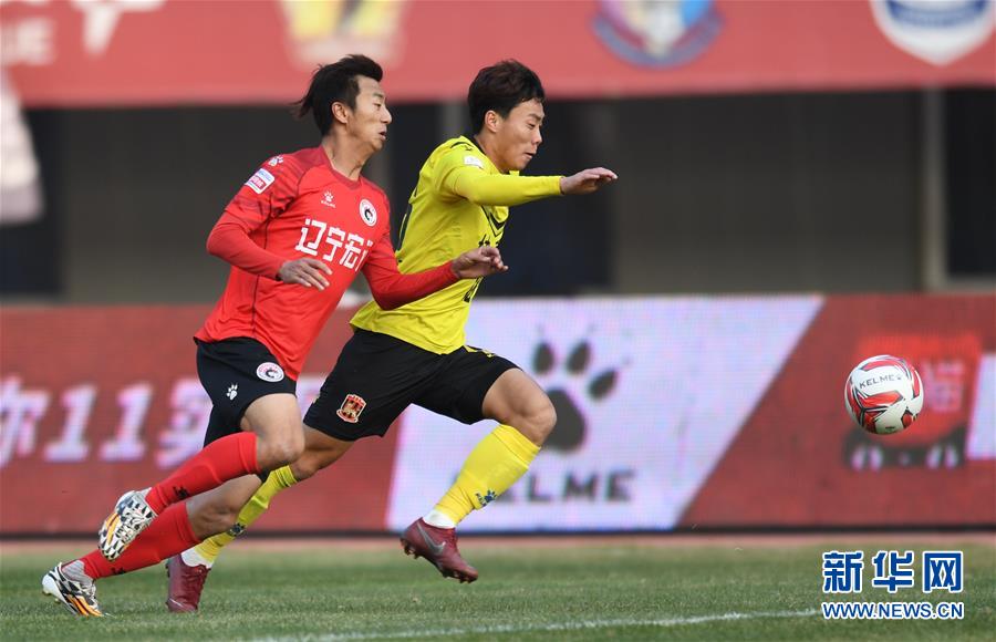 11月6日,辽宁沈阳宏运队球员李家赫(左)与苏州东吴队球员李智在比赛中。 当日,在2019年中甲联赛、中乙联赛附加赛首回合比赛中,辽宁沈阳宏运队主场以0比0战平苏州东吴队。 新华社记者龙雷摄