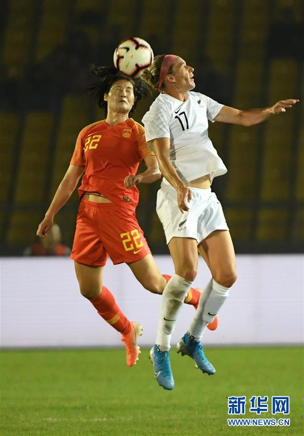 11月7日,中国队球员罗桂平(左)与新西兰队球员威尔金森在比赛中争顶。 当日,在2019CFA中国之队永川国际女子足球锦标赛中,中国队以2比0战胜新西兰队。 新华社记者唐奕摄