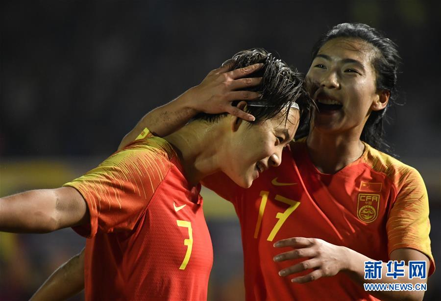 11月7日,中国队球员王霜(左)与古雅沙在进球后庆祝。 当日,在2019CFA中国之队永川国际女子足球锦标赛中,中国队以2比0战胜新西兰队。 新华社发(黄伟摄)