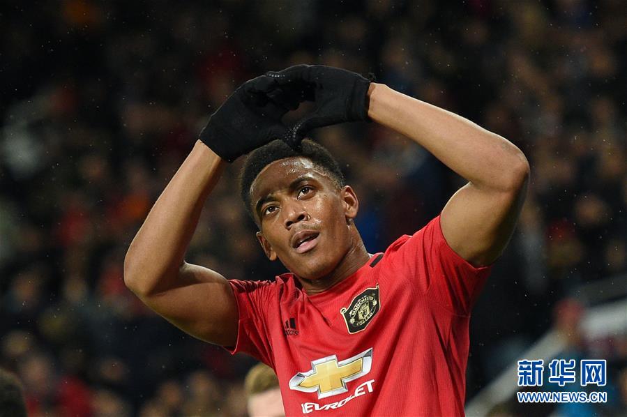 11月7日,曼联队球员马夏尔在进球后庆祝。 当日,在2019-2020赛季欧罗巴联赛小组赛L组比赛中,英超曼联队主场以3比0战胜塞尔维亚贝尔格莱德游击队。 新华社/法新