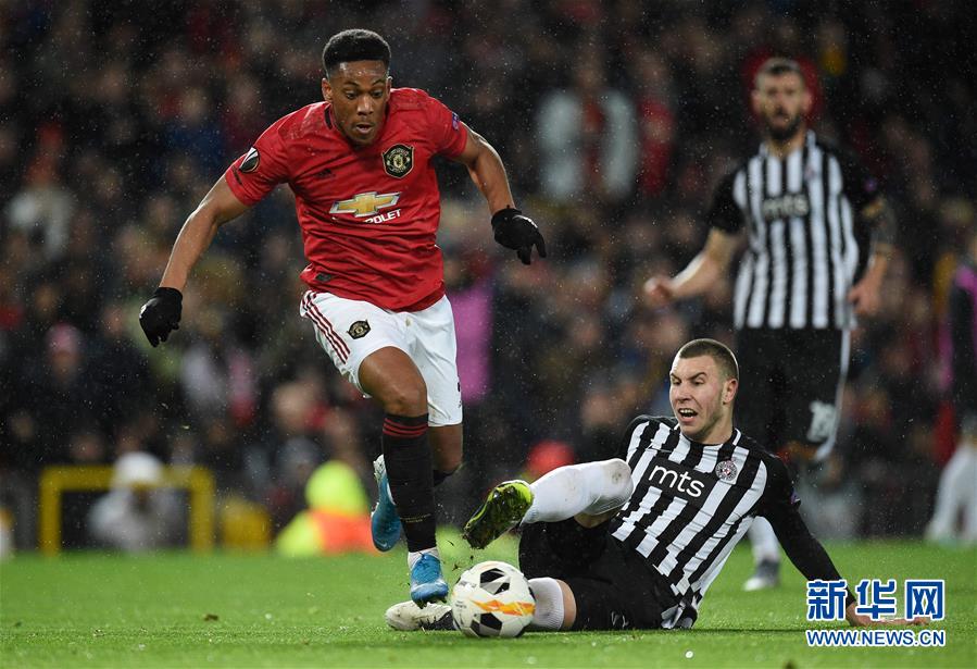 11月7日,曼联队球员马夏尔(左)在比赛中和贝尔格莱德游击队球员帕夫洛维奇拼抢。 当日,在2019-2020赛季欧罗巴联赛小组赛L组比赛中,英超曼联队主场以3比0战胜塞尔维亚贝尔格莱德游击队。 新华社/法新