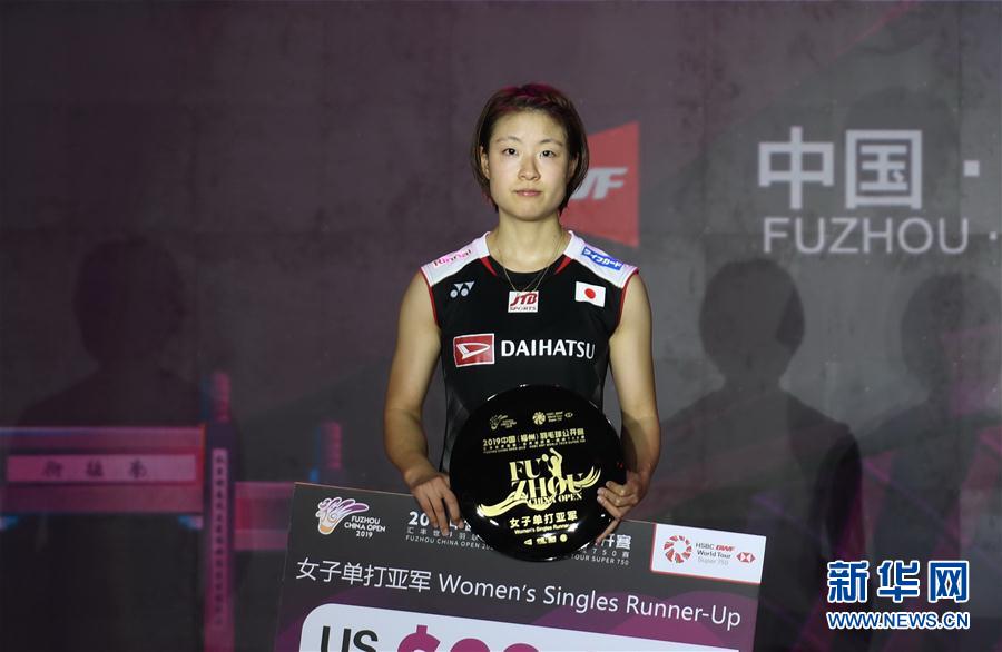 11月10日,日本选手奥原希望在颁奖仪式上。 当日,在2019中国(福州)羽毛球公开赛女单决赛中,中国选手陈雨菲以2比1战胜日本选手奥原希望,获得冠军。 新华社记者林善传摄