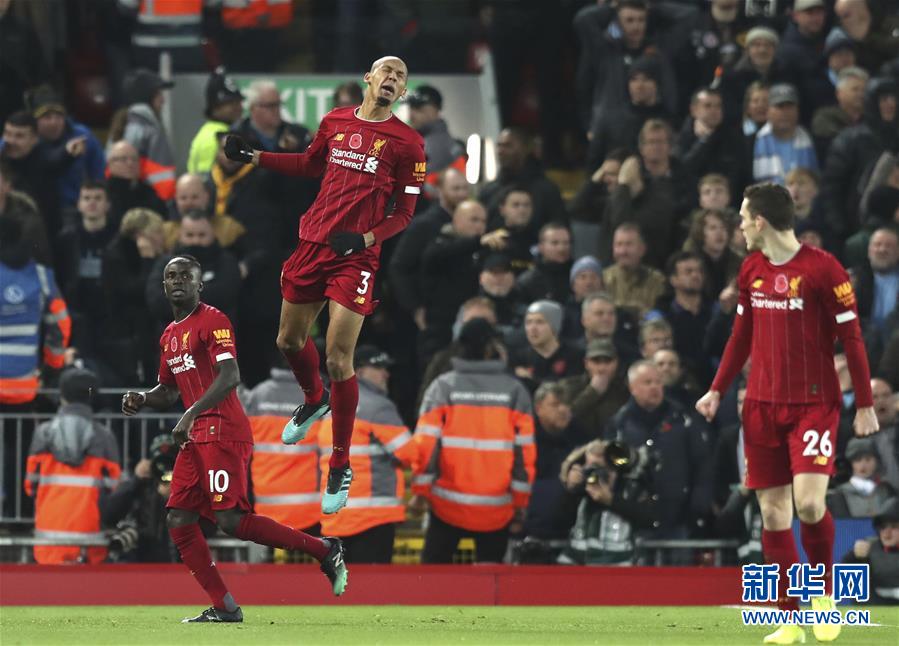 11月10日,利物浦队球员法比尼奥(上)进球后庆祝。 当日,在利物浦进行的2019-2020赛季英格兰足球超级联赛第12轮比赛中,利物浦队主场以3比1战胜曼彻斯特城队。 新华社/美联