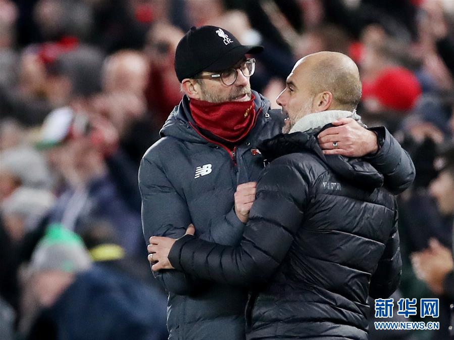 11月10日,利物浦队主教练克洛普(左)与曼城队主教练瓜迪奥拉赛后拥抱致意。 当日,在利物浦进行的2019-2020赛季英格兰足球超级联赛第12轮比赛中,利物浦队主场以3比1战胜曼彻斯特城队。 新华社/路透