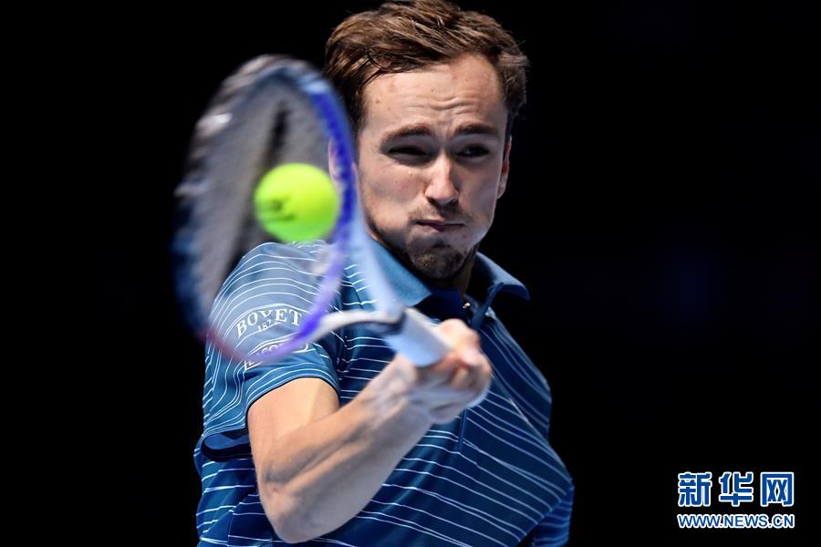 11月11日,俄罗斯选手梅德韦杰夫在比赛中回球。 当日,在2019ATP世界巡回赛年终总决赛第二日单打小组赛中,希腊选手西西帕斯以2比0战胜俄罗斯选手梅德韦杰夫。 新华社/路透