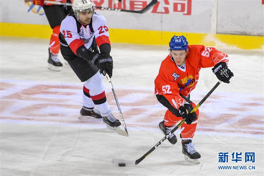 11月11日,吉林市城投队球员叶子豪(右)在比赛中拼抢。 当日,在2019-2020赛季丝路冰球超级联赛第22轮比赛中,吉林市城投队主场以5比1战胜坦波夫队。 新华社记者张楠摄