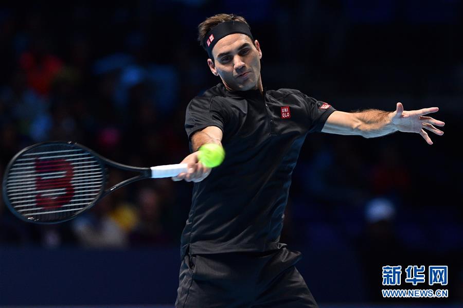 11月12日,瑞士选手费德勒在比赛中回球。 当日,在2019ATP世界巡回赛年终总决赛第三日单打小组赛中,瑞士选手费德勒以2比0战胜意大利选手贝雷蒂尼。 新华社/法新