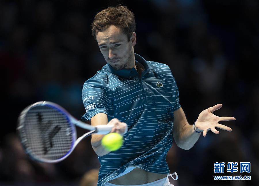 11月13日,俄罗斯选手梅德韦杰夫在比赛中回球。 当日,在2019ATP世界巡回赛年终总决赛第四日单打小组赛中,西班牙选手纳达尔以2比1艰难逆转战胜俄罗斯选手梅德韦杰夫,赢得首胜。 新华社记者韩岩摄