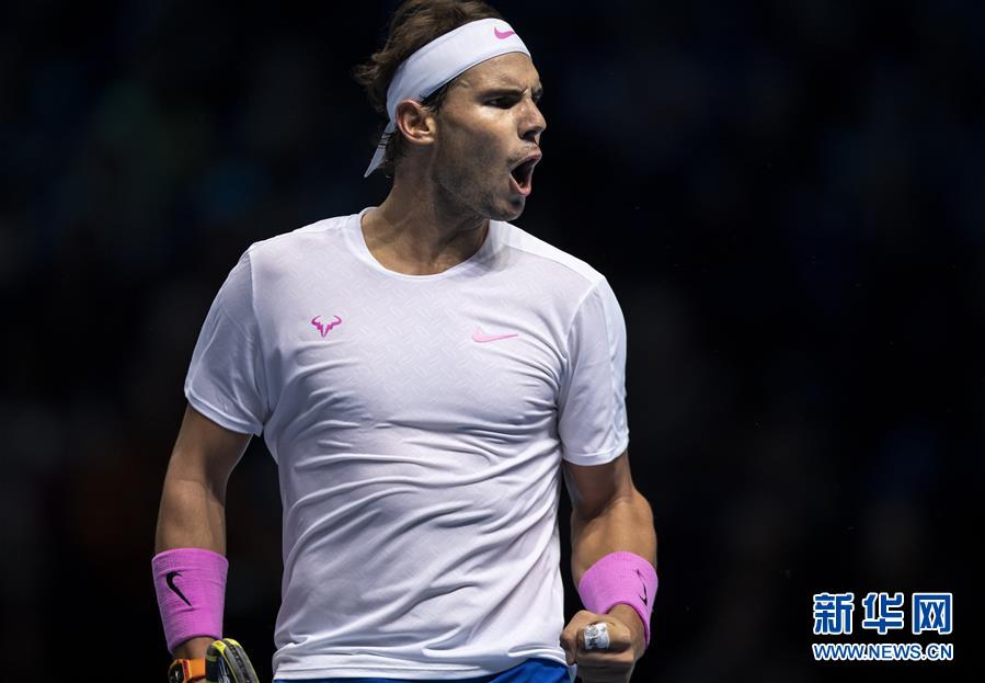11月13日,西班牙选手纳达尔在比赛中庆祝得分。 当日,在2019ATP世界巡回赛年终总决赛第四日单打小组赛中,西班牙选手纳达尔以2比1艰难逆转战胜俄罗斯选手梅德韦杰夫,赢得首胜。 新华社记者韩岩摄