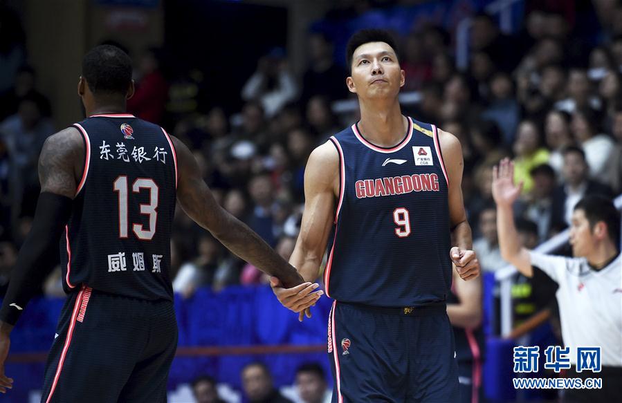 11月14日,广东东莞银行队球员易建联(前右)在比赛中和队友威姆斯击掌。 当日,在2019-2020赛季中国男子篮球职业联赛常规赛第五轮比赛中,广东东莞银行队客场以123比100战胜四川五粮金樽队。 新华社发(王曦摄)