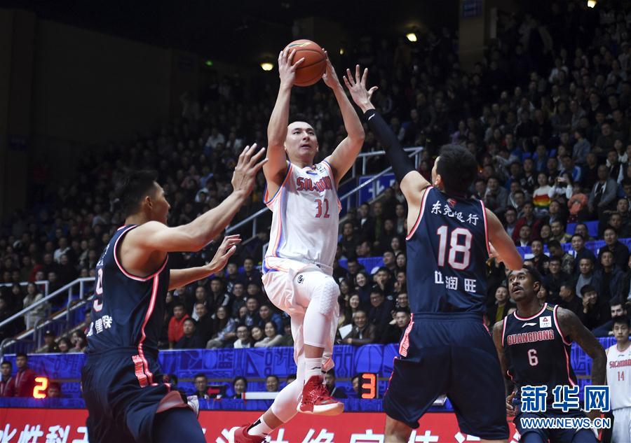 11月14日,四川五粮金樽队球员陈辰(左二)在比赛中上篮。 当日,在2019-2020赛季中国男子篮球职业联赛常规赛第五轮比赛中,广东东莞银行队客场以123比100战胜四川五粮金樽队。 新华社发(王曦摄)
