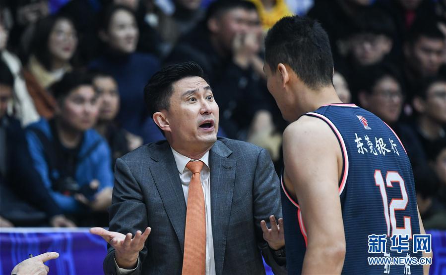 11月14日,广东东莞银行队主教练杜锋(左) 在比赛中指导球员苏伟。 当日,在2019-2020赛季中国男子篮球职业联赛常规赛第五轮比赛中,广东东莞银行队客场以123比100战胜四川五粮金樽队。 新华社记者薛玉斌摄