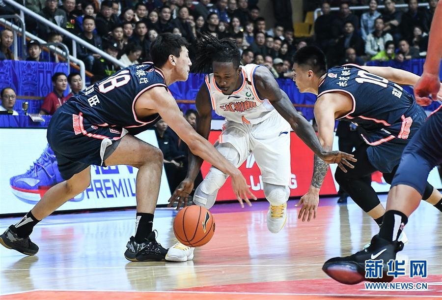 11月14日,四川五粮金樽队球员福特森(中)在比赛中突破广东东莞银行队球员赵睿(右)的防守。 当日,在2019-2020赛季中国男子篮球职业联赛常规赛第五轮比赛中,广东东莞银行队客场以123比100战胜四川五粮金樽队。 新华社记者薛玉斌摄
