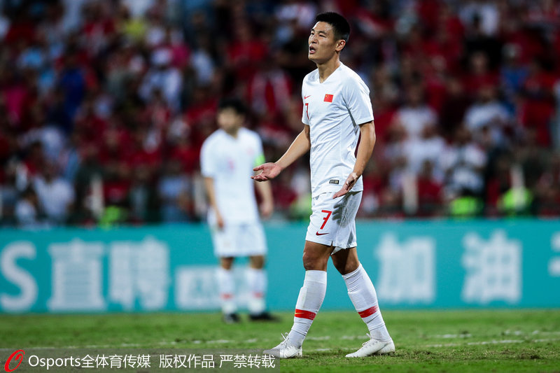 中国队首发(433):1-颜骏凌/17-王刚、5-张琳芃、22-朱辰杰、3-郑铮(85' 19-刘洋)/15-吴曦、14-池忠国(51' 4-韦世豪)、8-蒿俊闵/7-武磊、9-杨旭(62' 13-李可)、11-艾克森