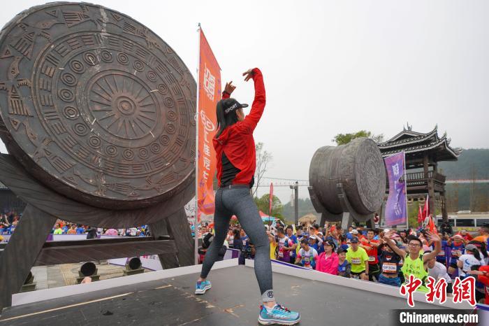 参赛选手在丹寨万达小镇铜鼓旁进行赛前热身。 贺俊怡 摄