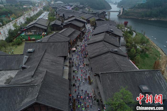航拍参赛选手穿过丹寨万达小镇。 贺俊怡 摄