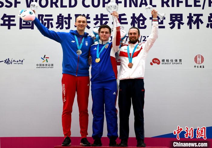 捷克选手菲利普·内佩奇(中)、塞尔维亚选手米连科 ·塞比奇(左)、俄罗斯选手谢尔盖·卡缅斯基(右)分获男子50米步枪3种姿势决赛冠、亚、季军。 王东明 摄