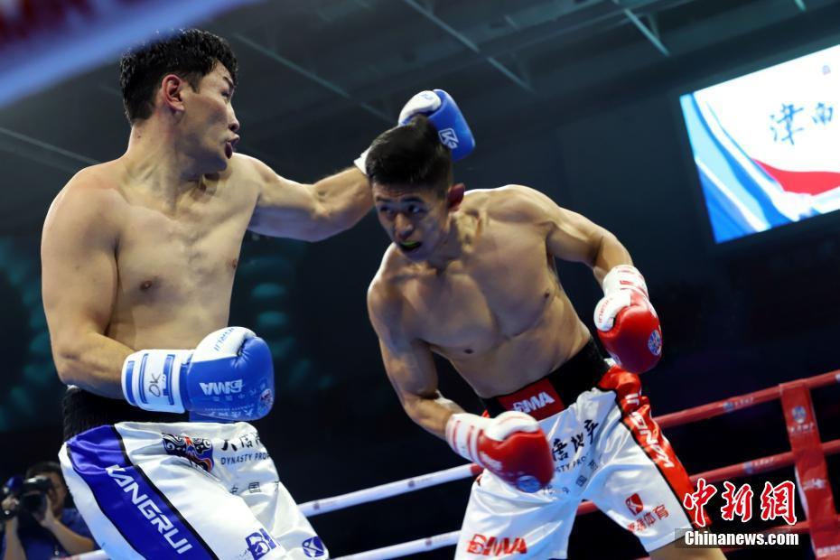11月23日晚间,2019大唐地产亚洲拳王大满贯资格赛天津站比赛在天津工业大学体育馆落幕,朝鲜选手五战全胜成最大赢家。中国选手发挥则相对一般,与外国选手的几场苦战,均未能取得胜利。图为91公斤级重量级比赛,中国选手修鹏程(右)连续两次被蒙古国选手桑达格伦·埃尔登巴亚尔(左)的单发重拳击倒,最终蒙古国选手埃尔登巴亚尔逆转获胜。 中新社记者 张道正 摄