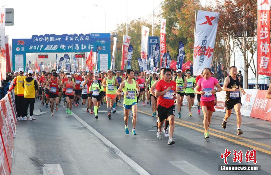 11月24日,2019特步衢州马拉松在浙江省衢州市开跑。本届赛事分为全程马拉松、半程马拉松和家庭跑,共有来自德国、法国、加拿大、美国、日本、新加坡、澳大利亚、肯尼亚、埃塞俄比亚、摩络哥等10个国家的34名外籍运动员和全国各地的11428名选手参赛,年龄最大的81周岁,最小的3周岁。衢州马拉松自2017年升级为全程赛事后,2017、2018连续两年荣获“浙江省优秀马拉松赛事”称号,并于2018年度成功获评中国田径协会铜牌赛事,现已成为衢州市全年规模最大、最具影响力的体育赛事之一,也是浙江西南部地区重要的国际性品牌赛事。图为起跑。 中新社记者 杜洋 摄