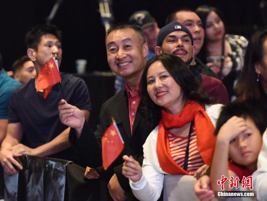 当地时间11月23日晚,美国加州印第奥市,中国M23战队拳手、WBA羽量级世界拳王徐灿客场击败美国挑战者罗伯斯,打赢其第二次世界拳王卫冕战,成功捍卫中国目前唯一的世界拳王金腰带。图为当地华侨华人为徐灿现场加油助威。 中新社记者 张朔 摄
