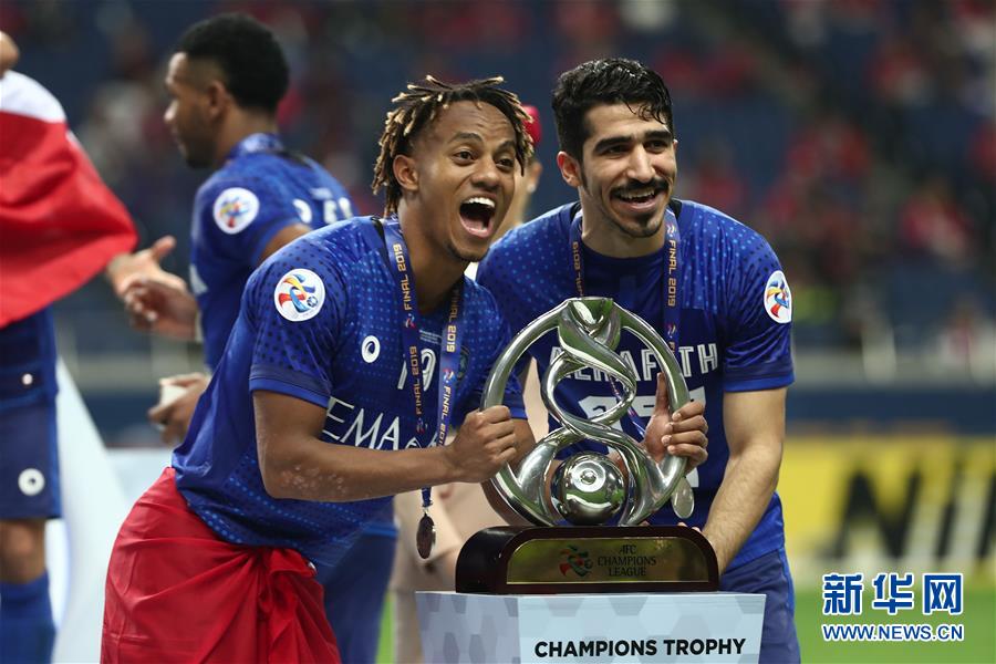 11月24日,阿尔希拉尔队球员卡里略(左)与队友哈菲斯在颁奖仪式上与奖杯合影。 当日,在日本琦玉进行的2019赛季亚冠联赛决赛第二回合比赛中,沙特阿拉伯阿尔希拉尔队客场以2比0战胜日本浦和红钻队,最终以3比0的总比分创造队史,首夺亚冠联赛冠军。 新华社/法新
