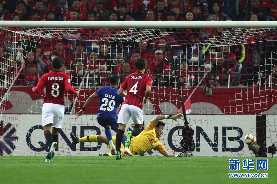 11月24日,阿尔希拉尔队球员萨勒姆(左二)在比赛中射门得分。 当日,在日本琦玉进行的2019赛季亚冠联赛决赛第二回合比赛中,沙特阿拉伯阿尔希拉尔队客场以2比0战胜日本浦和红钻队,最终以3比0的总比分创造队史,首夺亚冠联赛冠军。 新华社/法新