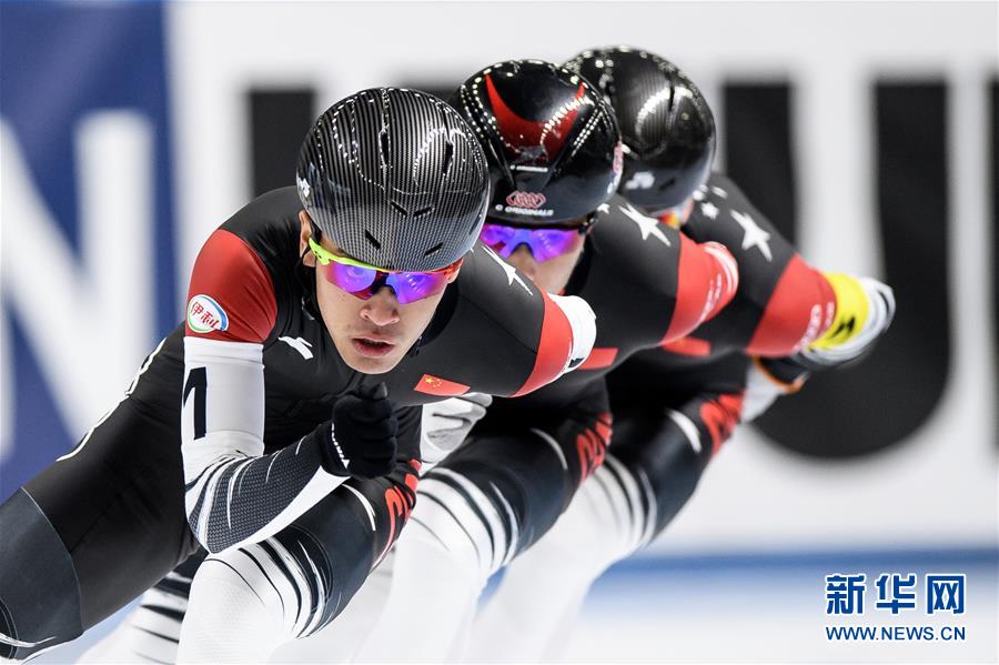 11月24日,中国队选手宁忠岩(前)、阿勒玛斯·卡汉拜(中)和哈那哈提·木哈买提在比赛中。 当日,在2019-2020赛季国际滑联速度滑冰世界杯波兰站男子团体追逐赛B组比赛中,中国队以3分50秒692夺得第一名。 新华社发(拉法尔摄)