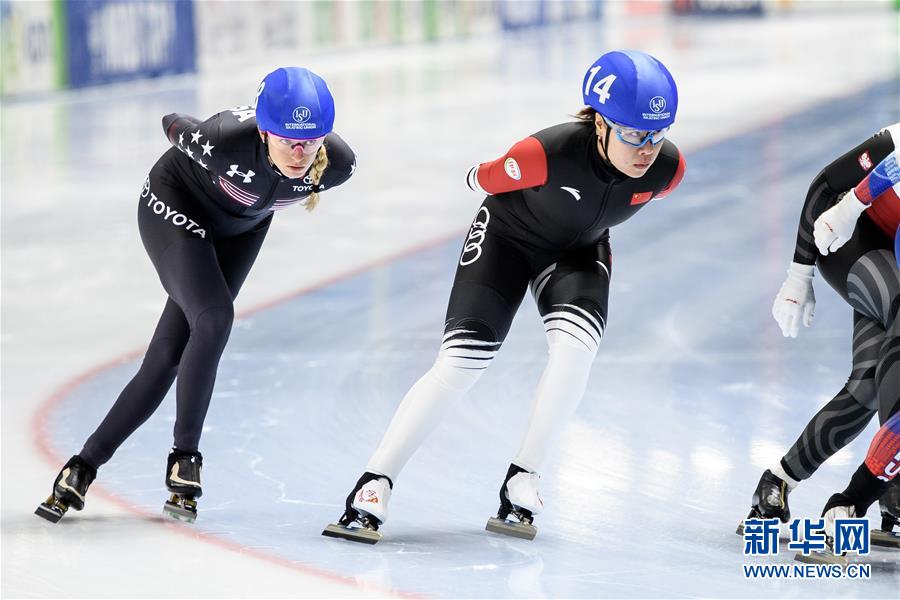 11月24日,中国选手周洋(左二)在比赛中。 当日,在2019-2020赛季国际滑联速度滑冰世界杯波兰站女子集体出发决赛中,中国选手周洋获得第四名。 新华社发(拉法尔摄)
