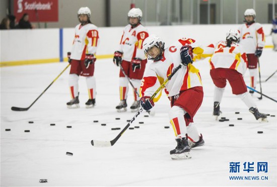 11月24日,中国U18女子冰球队球员杜思佳(前)在教学赛前进行训练。 为备战2020年1月在波兰举行的国际冰联女子U18世锦赛,中国U18女子冰球队于11月18日至12月9日在加拿大进行集训,期间计划进行九场教学赛。 新华社发(邹峥摄)
