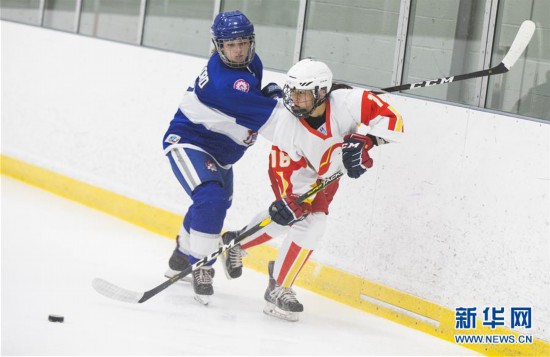 11月24日,中国U18女子冰球队球员张鑫茹(右)在教学赛中与对手拼抢。 为备战2020年1月在波兰举行的国际冰联女子U18世锦赛,中国U18女子冰球队于11月18日至12月9日在加拿大进行集训,期间计划进行九场教学赛。 新华社发(邹峥摄)