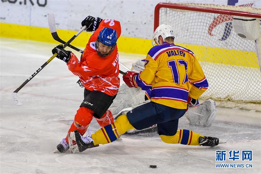 11月25日,吉林市城投队球员刘义强(右一)在比赛中拼抢。 当日,在2019-2020赛季丝路冰球超级联赛第27轮比赛中,吉林市城投队主场以2比1战胜俄罗斯化学家队。 新华社记者张楠摄