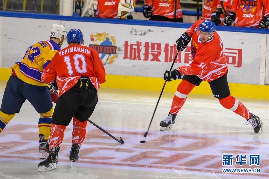 11月25日,吉林市城投队球员吉鸿远(左)在比赛中拼抢。 当日,在2019-2020赛季丝路冰球超级联赛第27轮比赛中,吉林市城投队主场以2比1战胜俄罗斯化学家队。 新华社记者张楠摄