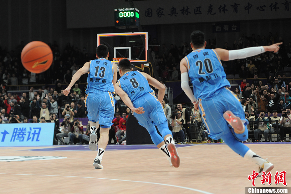 11月26日,CBA联赛第十轮再演北京德比,北控队在全场大部分时间领先的情况下,末节遭首钢队疯狂反扑,前三节累积19分优势被消耗殆尽。最后22秒,首钢队更是连得12分,朱彦西上演3分绝杀,北京首钢队以91:90拿下北京德比二番战。图为首钢队朱彦西上演绝杀后与队友绕场庆祝。中新网记者 李骏 摄