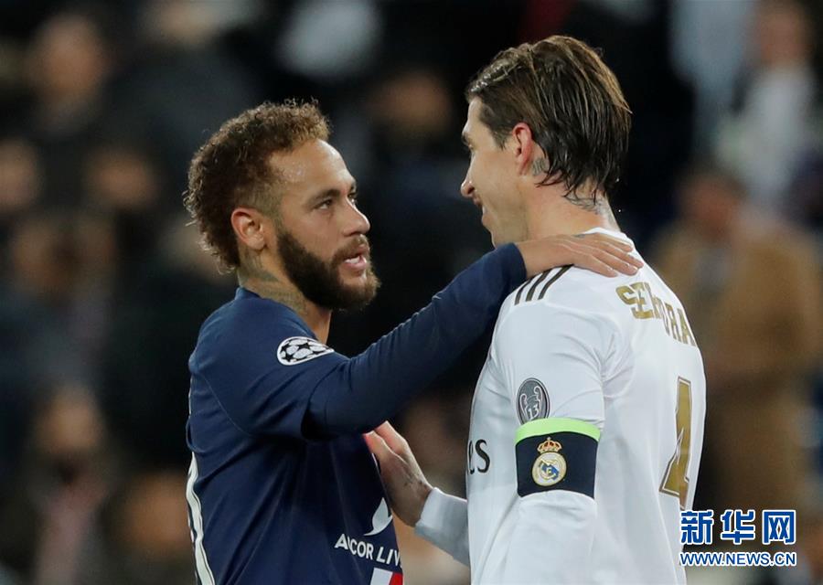 11月26日,皇家马德里队球员拉莫斯(右)与巴黎圣日耳曼队球员内马尔在赛后相互致意。 当日,在2019-2020赛季欧洲足球冠军联赛A组比赛中,皇家马德里队主场以2比2战平巴黎圣日耳曼队。 新华社/路透
