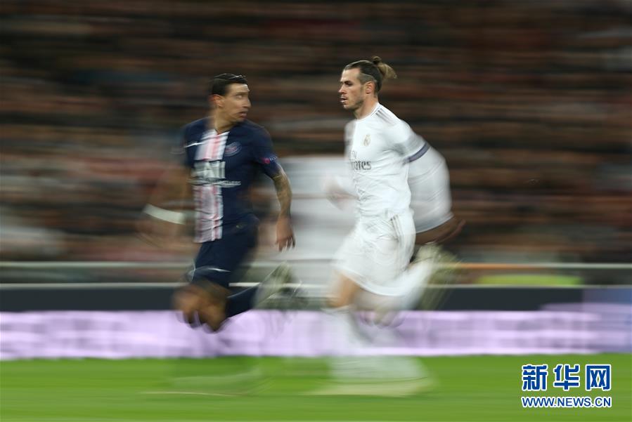 11月26日,皇家马德里队球员贝尔(右)与巴黎圣日耳曼队球员迪马利亚拼抢。 当日,在2019-2020赛季欧洲足球冠军联赛A组比赛中,皇家马德里队主场以2比2战平巴黎圣日耳曼队。 新华社/路透