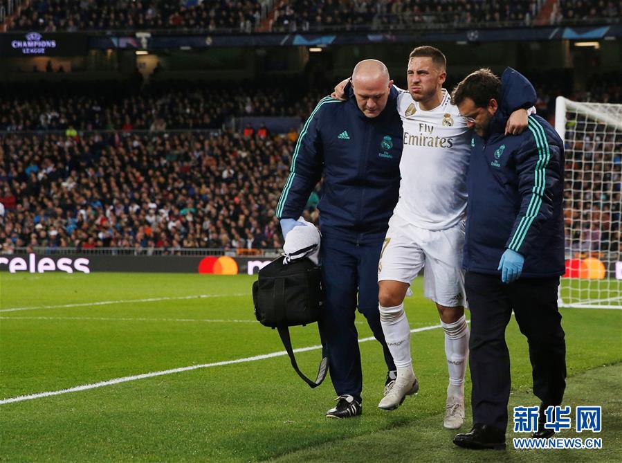 11月26日,皇家马德里队球员阿扎尔(中)受伤后被扶下场。 当日,在2019-2020赛季欧洲足球冠军联赛A组比赛中,皇家马德里队主场以2比2战平巴黎圣日耳曼队。 新华社/路透
