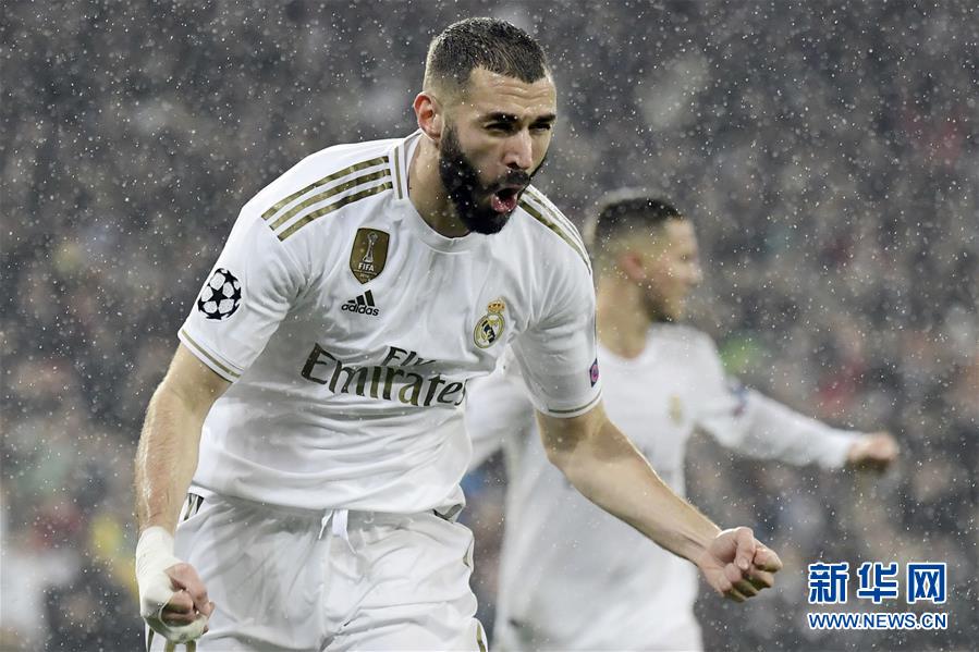 11月26日,皇家马德里队球员本泽马庆祝进球。 当日,在2019-2020赛季欧洲足球冠军联赛A组比赛中,皇家马德里队主场以2比2战平巴黎圣日耳曼队。 新华社/法新