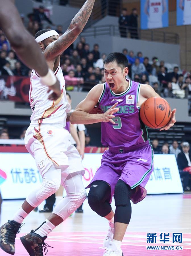 11月26日,山东西王队球员张庆鹏(右)在比赛中进攻。 当日,在2019-2020赛季中国男子篮球职业联赛(CBA)常规赛第10轮比赛中,浙江稠州银行队主场以109比107战胜山东西王队。 新华社记者黄宗治摄