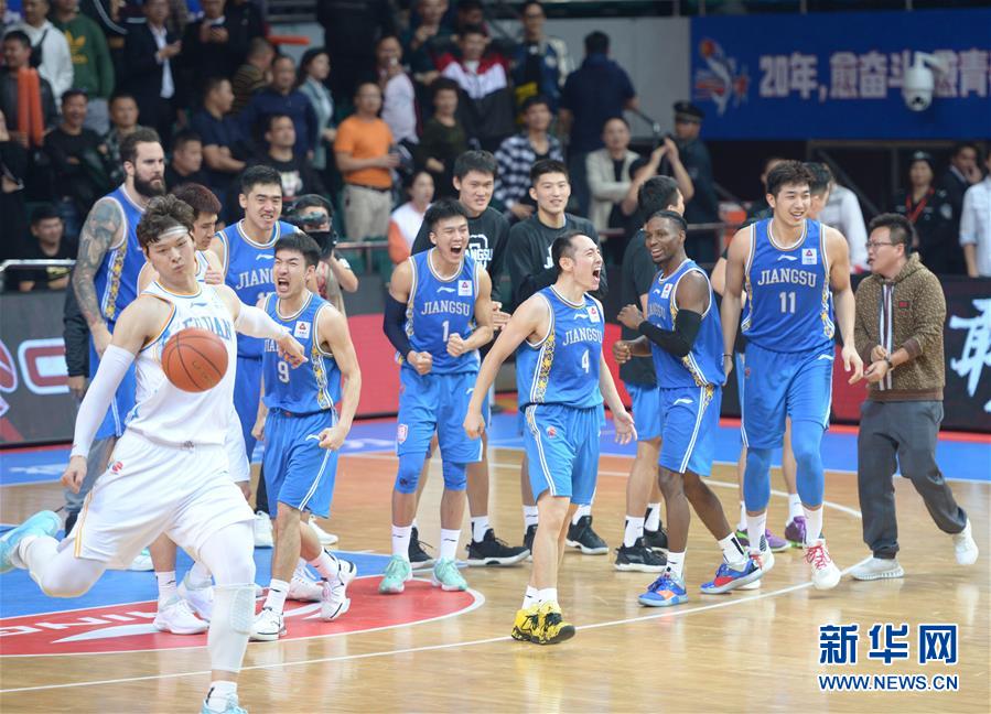 11月27日,苏州肯帝亚队球员在比赛后庆祝胜利。 当日,在2019-2020赛季中国男子篮球职业联赛(CBA)常规赛第10轮比赛中,福建豹发力队主场以126比127不敌苏州肯帝亚队。 新华社记者贺灿铃摄