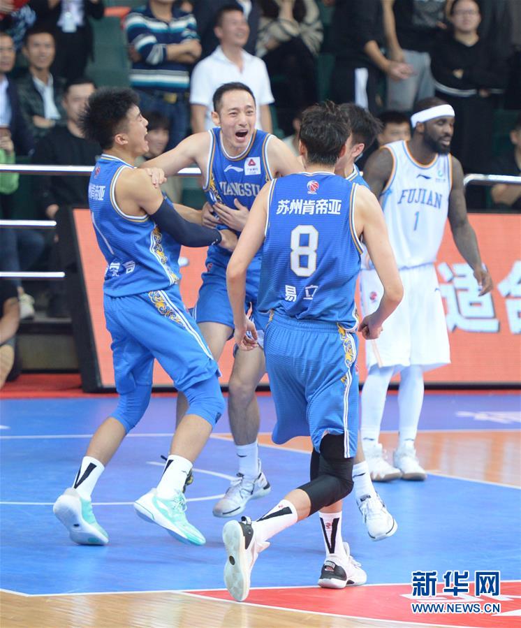 11月27日,苏州肯帝亚队球员史鸿飞(左二)在投入绝杀球后庆祝胜利。 当日,在2019-2020赛季中国男子篮球职业联赛(CBA)常规赛第10轮比赛中,福建豹发力队主场以126比127不敌苏州肯帝亚队。 新华社记者贺灿铃摄