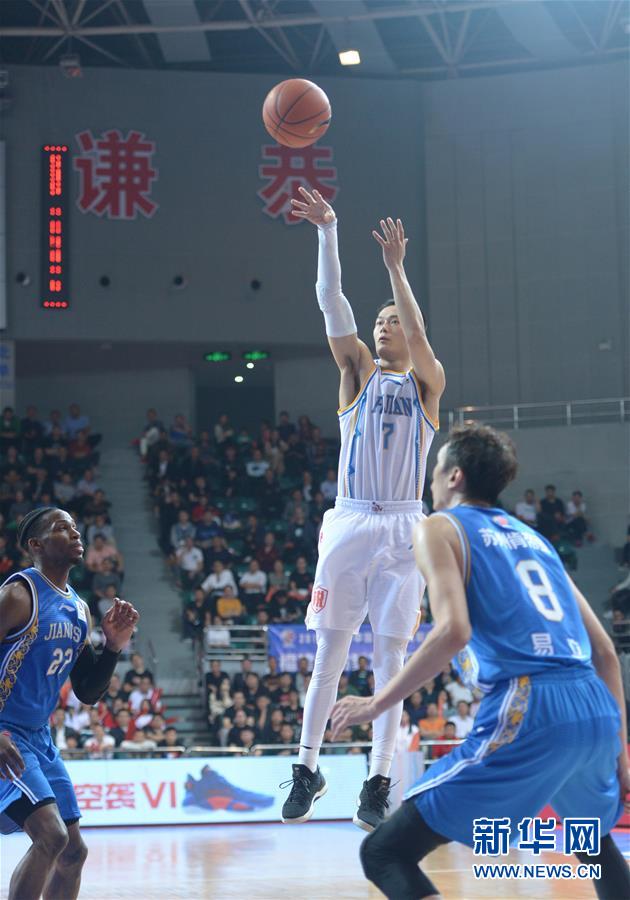 11月27日,福建豹发力队球员汤杰(中)在比赛中投篮。 当日,在2019-2020赛季中国男子篮球职业联赛(CBA)常规赛第10轮比赛中,福建豹发力队主场以126比127不敌苏州肯帝亚队。 新华社记者贺灿铃摄