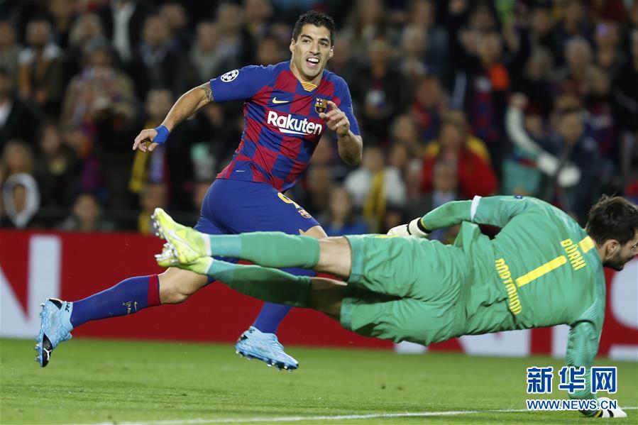 11月27日,巴塞罗那队球员苏亚雷斯(左)进球。 当日,在2019-2020赛季欧洲足球冠军联赛F组比赛中,巴塞罗那队主场以3比1战胜多特蒙德队。 新华社/美联