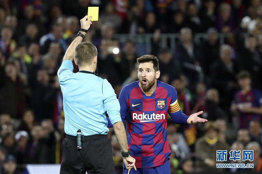 11月27日,巴塞罗那队球员梅西(右)被裁判出示黄牌。 当日,在2019-2020赛季欧洲足球冠军联赛F组比赛中,巴塞罗那队主场以3比1战胜多特蒙德队。 新华社/美联