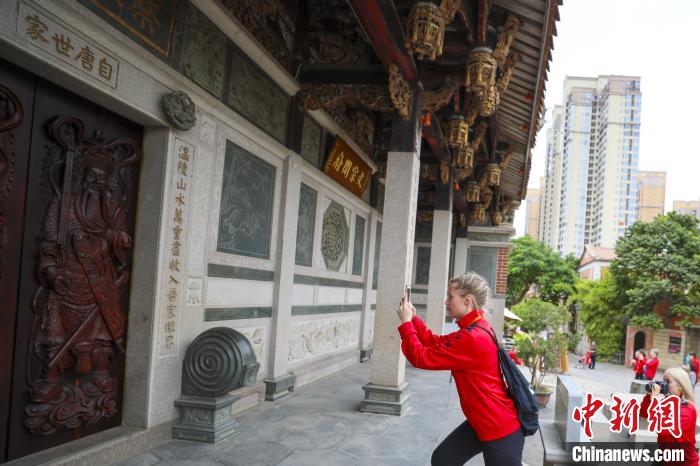 海外球员用手机拍摄历史悠久的特色建筑。 钟欣 摄