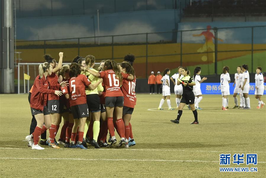 11月28日,加拿大渥太华大学队球员在比赛后庆祝胜利。 当日,在2019年国际大体联足球世界杯女子组半决赛中,中国北京师范大学队在常规时间与加拿大渥太华大学队0比0战平,最终在点球大战中以3比5不敌对手,无缘决赛。 新华社记者贺灿铃摄