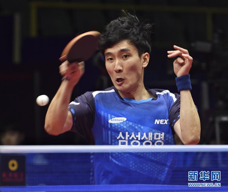 11月29日,李尚洙在比赛中回球。 当日,在成都举行的2019国际乒联男子世界杯单打预赛中,韩国选手李尚洙以4比2战胜美国选手卡奈克。 新华社记者刘坤摄
