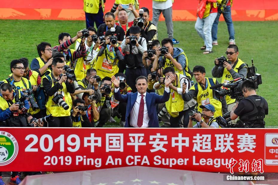 12月1日,在刚刚结束的2019赛季中超末轮比赛中,广州恒大主场3:0战胜上海申花,队史第8次夺得中超冠军。广州恒大曾在2011至2017赛季完成中超7连冠伟业,本赛季又在与北京国安、上海上港的激烈竞争中成为赢家,从而荣膺中超“八冠王”。图为广州恒大淘宝队主教练卡纳瓦罗(中)在夺冠庆典上向球迷致意。中新社记者 陈骥旻 摄