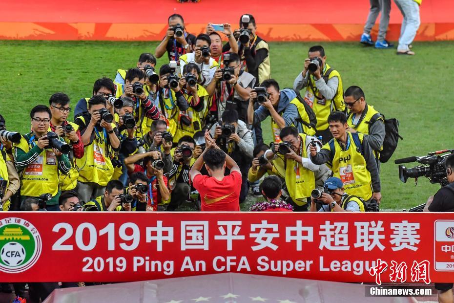12月1日,在刚刚结束的2019赛季中超末轮比赛中,广州恒大主场3:0战胜上海申花,队史第8次夺得中超冠军。广州恒大曾在2011至2017赛季完成中超7连冠伟业,本赛季又在与北京国安、上海上港的激烈竞争中成为赢家,从而荣膺中超“八冠王”。图为广州恒大淘宝队球员郑智(中)在夺冠庆典上受到媒体关注。中新社记者 陈骥旻 摄