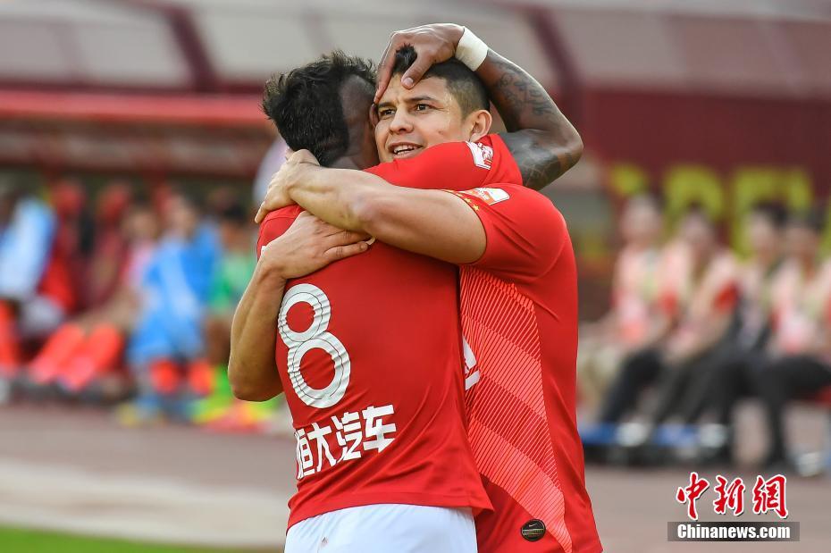 12月1日,在刚刚结束的2019赛季中超末轮比赛中,广州恒大主场3:0战胜上海申花,队史第8次夺得中超冠军。广州恒大曾在2011至2017赛季完成中超7连冠伟业,本赛季又在与北京国安、上海上港的激烈竞争中成为赢家,从而荣膺中超“八冠王”。图为广州恒大淘宝队球员艾克森(右)在比赛中进球后与队友拥抱庆祝。中新社记者 陈骥旻 摄